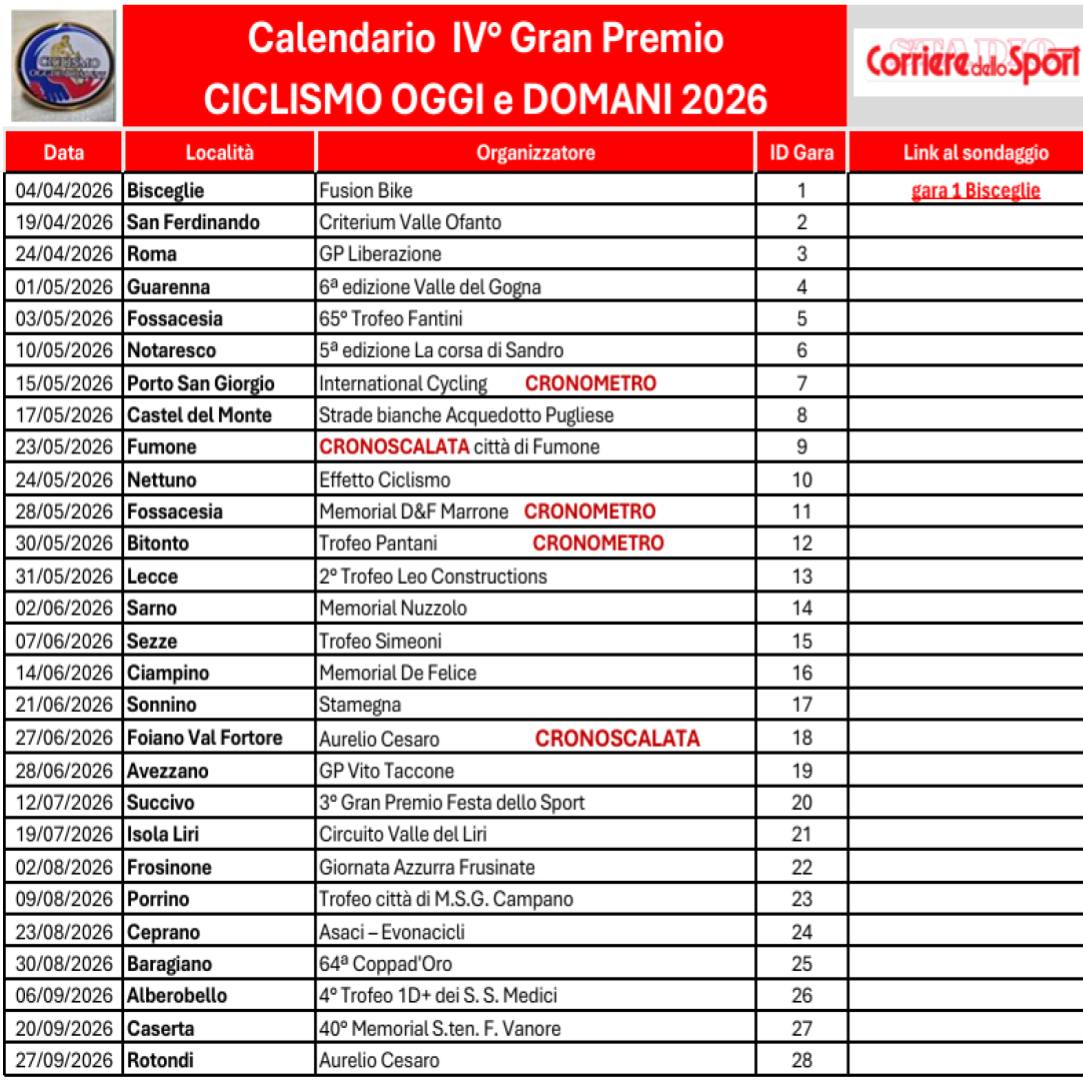 Il GP CICLISMO OGGI E DOMANI è iniziato con la prova di Bisceglie che si è svolta sabato 4 aprile. La prima di un ricco calendario che conta ben 28 gare distribuite in diverse Regioni del Centro Sud Italia. Di seguito il Calendario aggiornato e le classifiche provvisorie del GP.