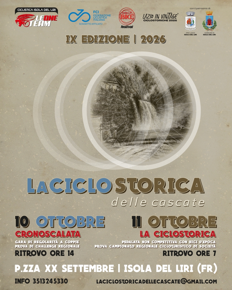 In chiusura e in attesa di ulteriori novità è del tutto ovvia la presenza de La Ciclostorica delle Cascate nel nutrito programma di Isola Liri BIKE Festival 2026.